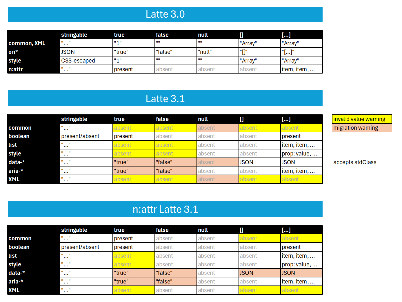 Když je toto zapnuto, Latte během vykreslování porovnává, jak by atribut vypadal ve verzi 3.0 a jak vypadá ve verzi 3.1. Pokud se výstup liší, vyhodí warning.